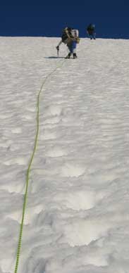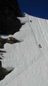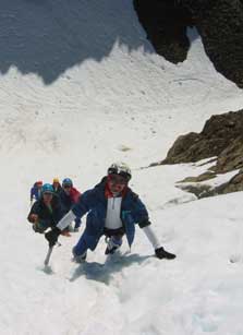 the West peak. We climb up steep snow until we attain access to the summit