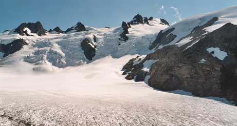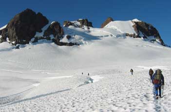 Route Description From Snow Dome, proceed through a 7200-ft snow pass S 20 degrees E. Turn right and climb WSW to the top of the false summit. Drop to the saddle between the false summit and the West Peak and climb steep snow to the NE side of the rock summit; from here, the top is reached after a short steep rock climb. |