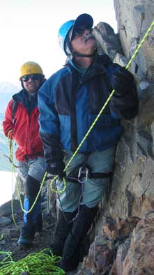 us from our goal, 60 feet of Class 5.4 rock. Terry and Rod take charge and