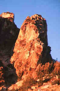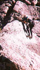 We got up early and were climbing by 6 AM. The first pitch was suppose to be a 5.5 slab move. But instead, we inadvertently began the route with a more difficult oblique crack, lead by Terry. Off route already! (hereafter known as the Vulgarian Variation!)